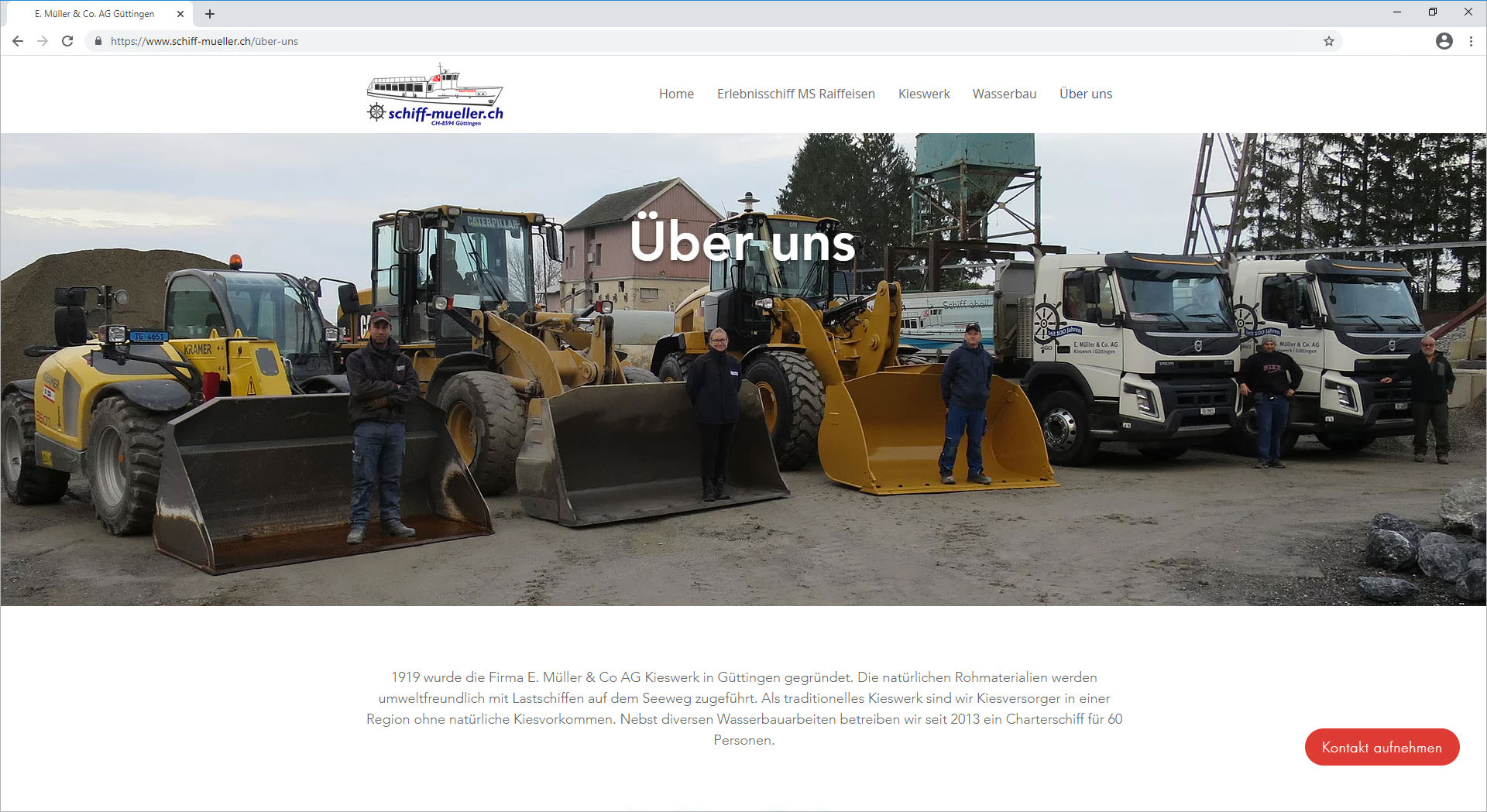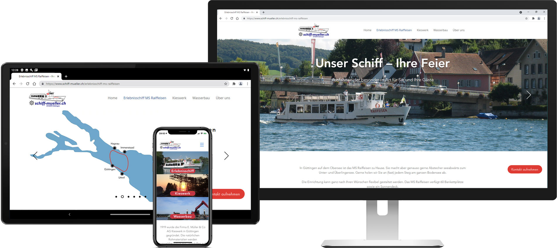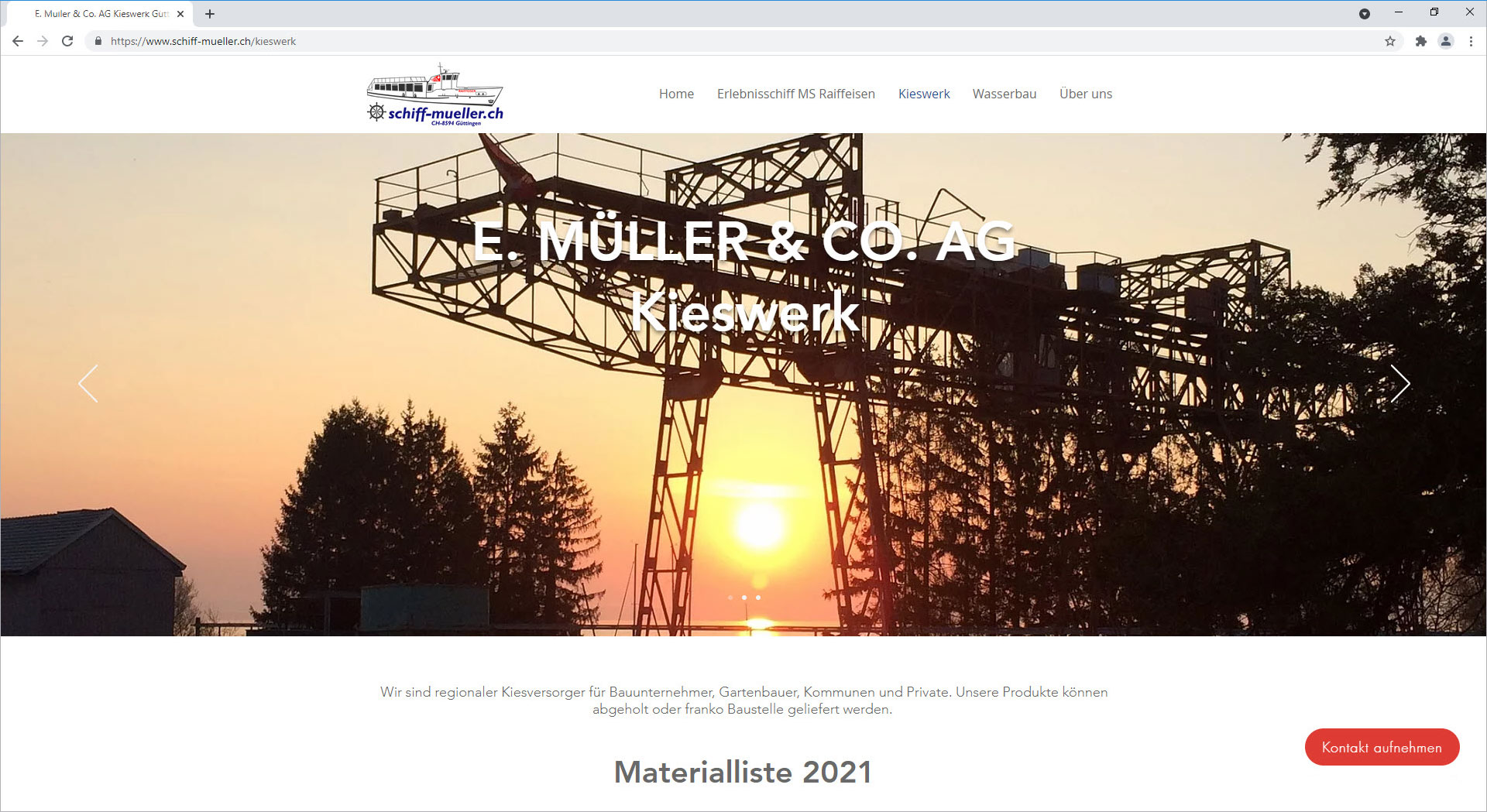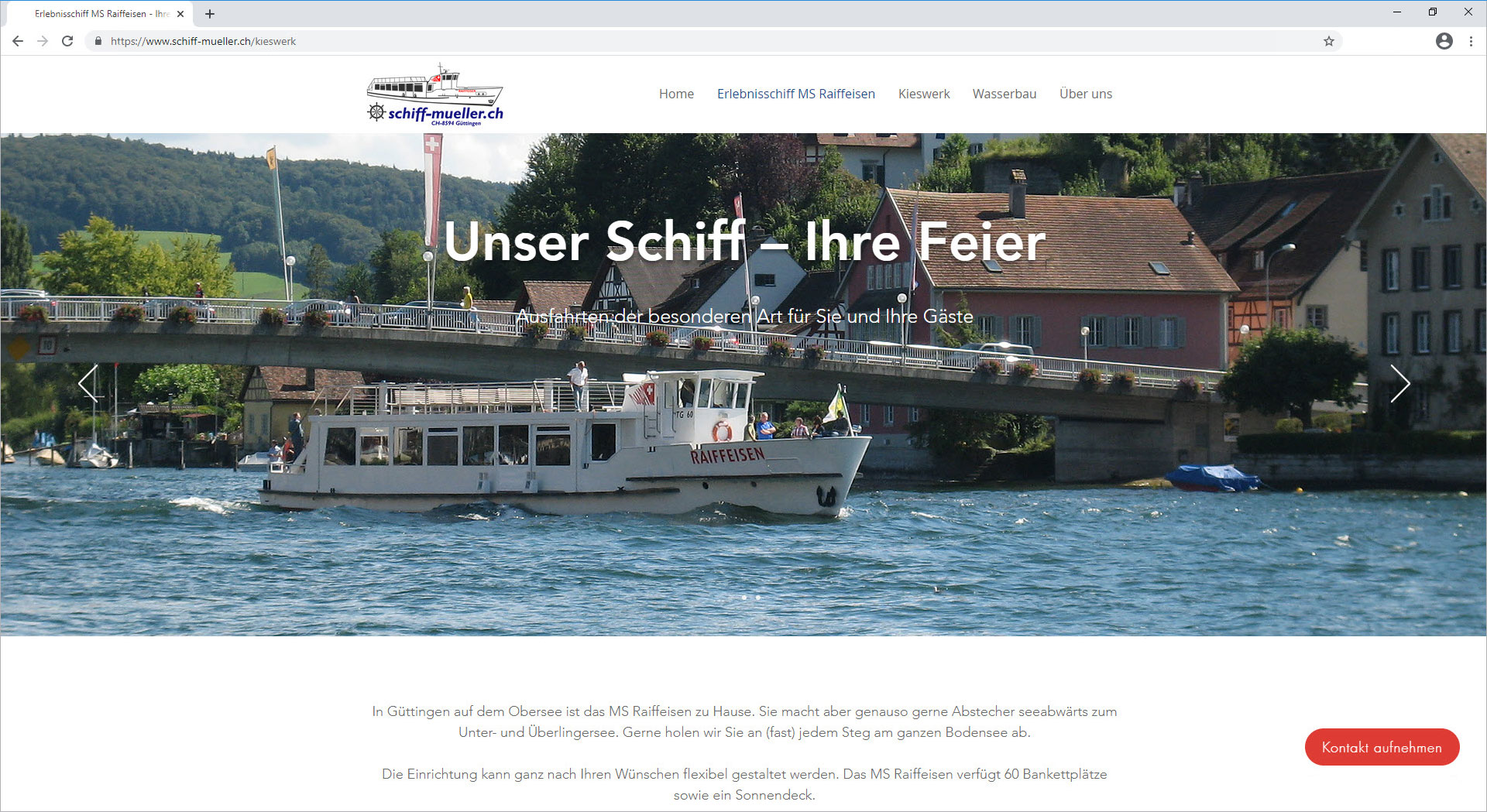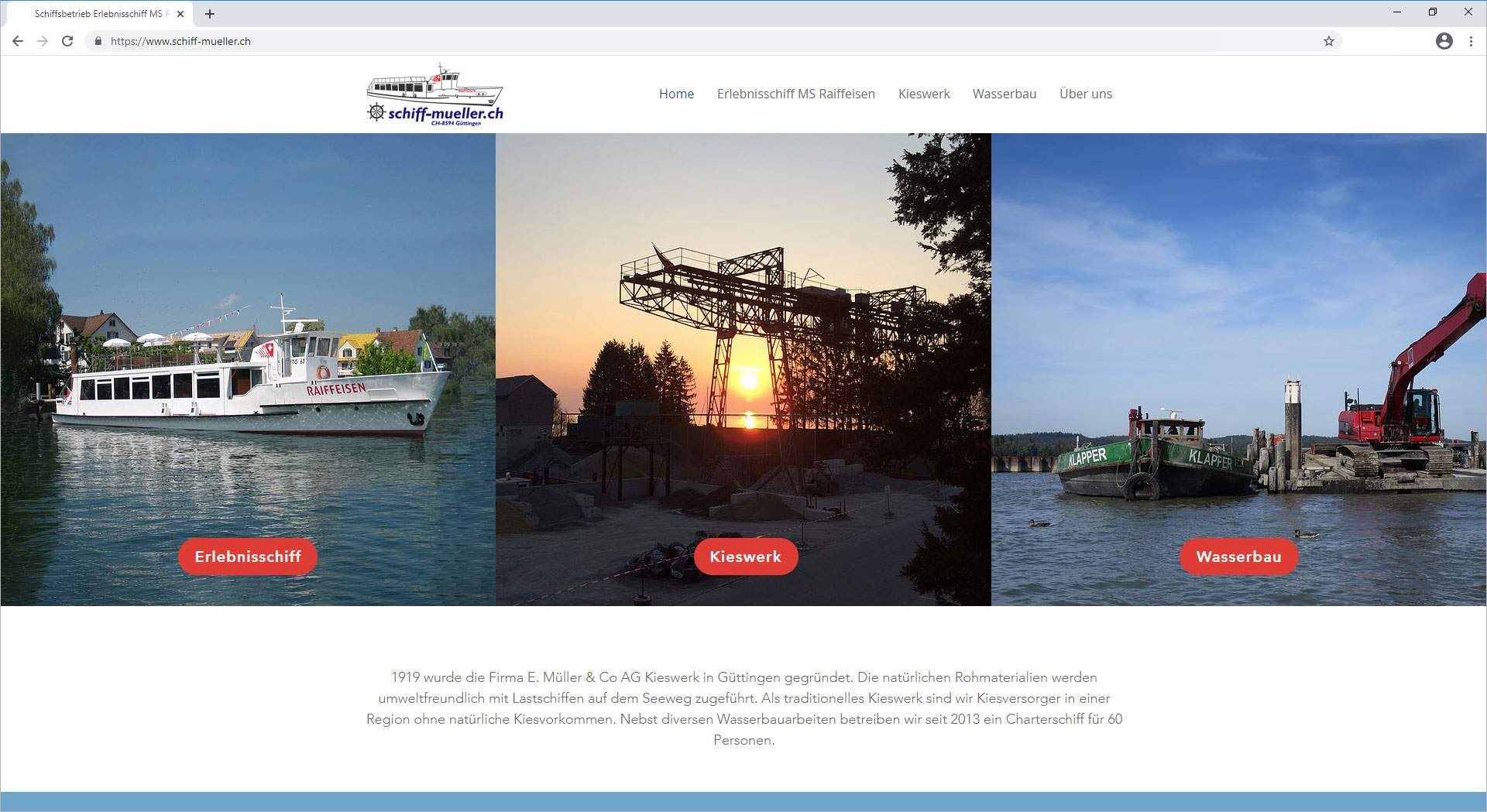 Unter der www.schiff-mueller.ch findet man nun eine moderne Website mit einer übersichtlichen Menü-Navigation, die die drei Bereiche Erlebnisschiff, Kieswerk und Wasserbau abbildet.