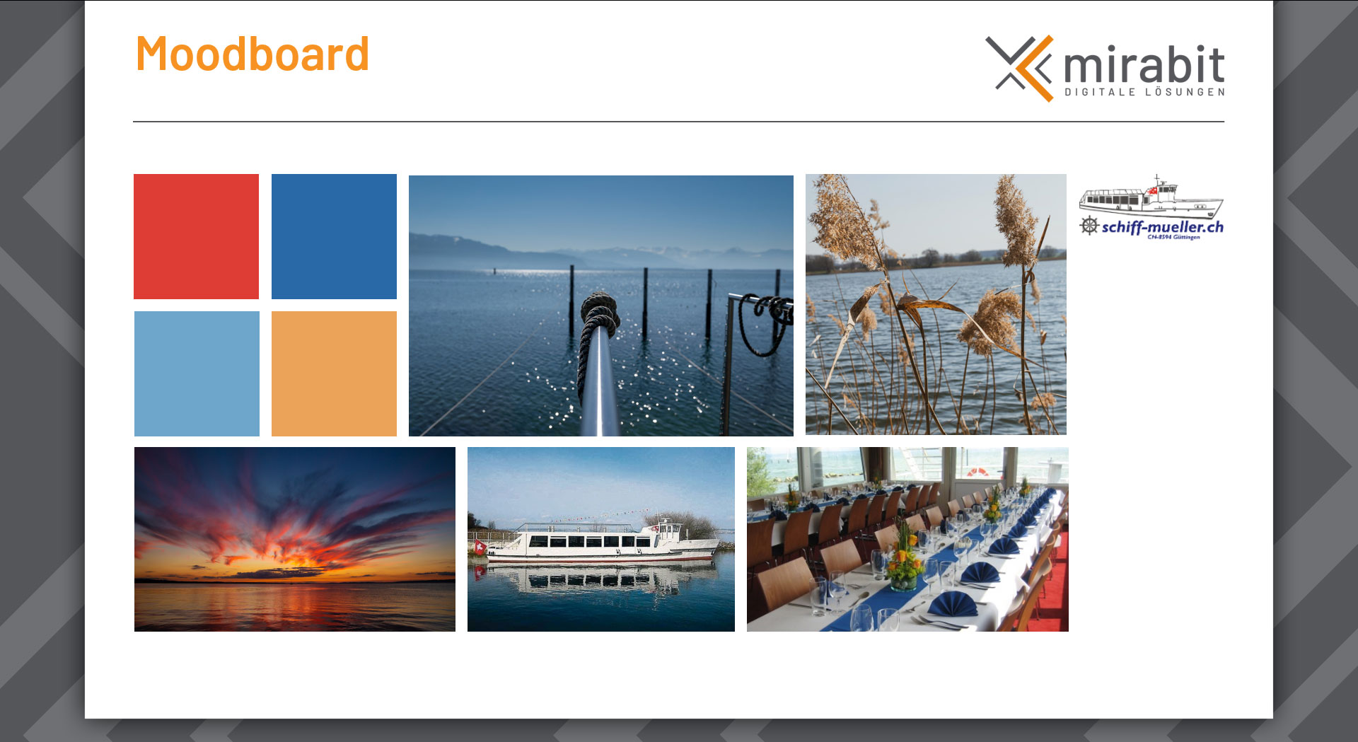 Mirabit hat bei der Ausarbeitung des Design-Konzepts ein Moodboard erarbeitet, das die Farben der MS Raiffeisen (rot) und des Bodensees (blau) ergänzt mit orange (Sonnenuntergang) und hellblau (Himmel).